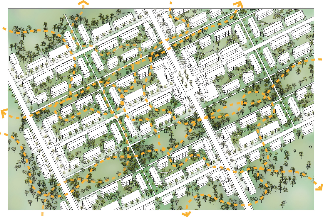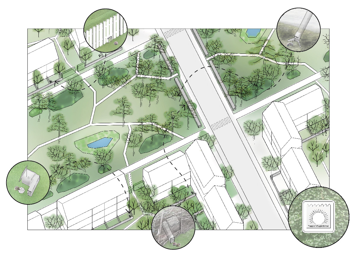 En grundläggande förutsättning är att skapa en mobilitetshubb i stadsdelens utkant varifrån fordonsrörelser utgår. Detta ger ett rikare stadsliv till fots inne i själva området och samtidigt betydligt färre bilar i rörelse. Utforma gångfartsgatorna med åtgärder som påtagligt minskar fordonshastigheten och därmed också påkörningsrisken. Skapa faunapassager av typen ”grodtunnlar” (det kan även fungera för igelkottarna) under de större stadsgatorna i strategiska lägen mellan park- och naturområdena.